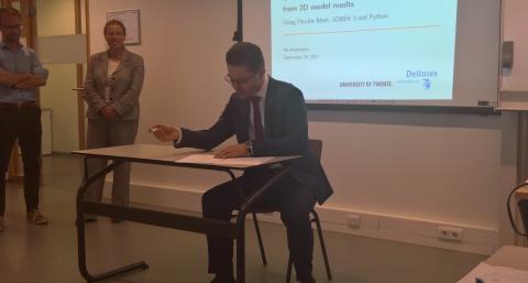 Gisteren heeft Heer Awakimjan zijn ingenieurstitel behaald. Na een ingewikkeld verhaal over 1-dimensionale modellen van 2-dimensionale modellen van 3-dimensionale rivieren en kanalen, mocht hij zijn diploma in ontvangst nemen. Het tekenen van het diploma verliep probleemloos, waarna hij en wij erachter dat zelfs het predicaat Cum Laude was toegekend!